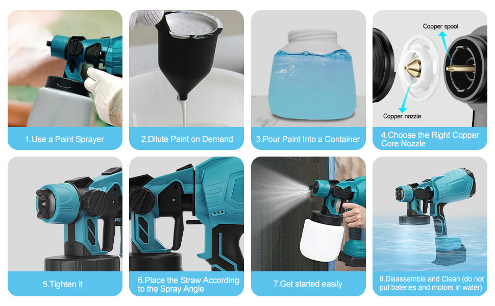 When spraying, keep the spray gun 25-40cm(9.8-15.8in) away from the surface, can adjust to achieve the best spray effect. Easilydetachable and assemble, cleanup water or cleaner.During use and clean, please make sure toavoid getting the battery and the body of the device wet.